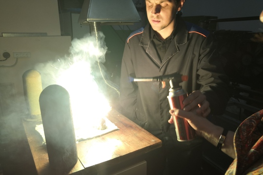 Заключительной точкой маршрута стал отдел структурной макрокинетики Томского научного центра СО РАН. Здесь под руководством младшего научного сотрудника лаборатории физической активации Никиты Пичугина гости своими руками запустили процесс самораспространяющегося высокотемпературного синтеза.