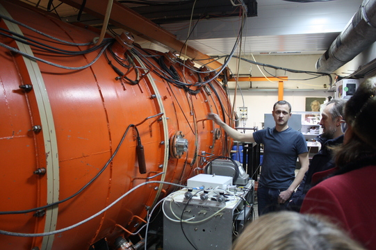 В Институте сильноточной электроники СО РАН гости увидели уникальную исследовательскую установку МИГ – многоцелевой импульсный генератор тераваттного уровня мощности, предназначенный для работ с мощными электронными пучками, плазменными лайнерами, по скиновому взрыву металлов и исследованию фазовых превращений вещества при сверхвысоких давлениях. Как отметил научный сотрудник отдела высоких плотностей энергии Владислав Ванькевич, по совокупности параметров аналогичных установок в России и в мире не существует.