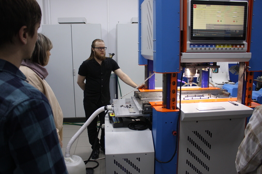 Первой точкой экскурсионного маршрута стал Институт физики прочности и материаловедения СО РАН, где научный сотрудник лаборатории контроля качества материалов и конструкций Александр Елисеев показал гостям оборудование для сварки трением с перемешиванием и ультразвуковым воздействием. Он объяснил, как работает эта технология, применяемая при изготовлении современной космической техники, и в чем ее преимущества перед традиционной электродуговой сваркой.