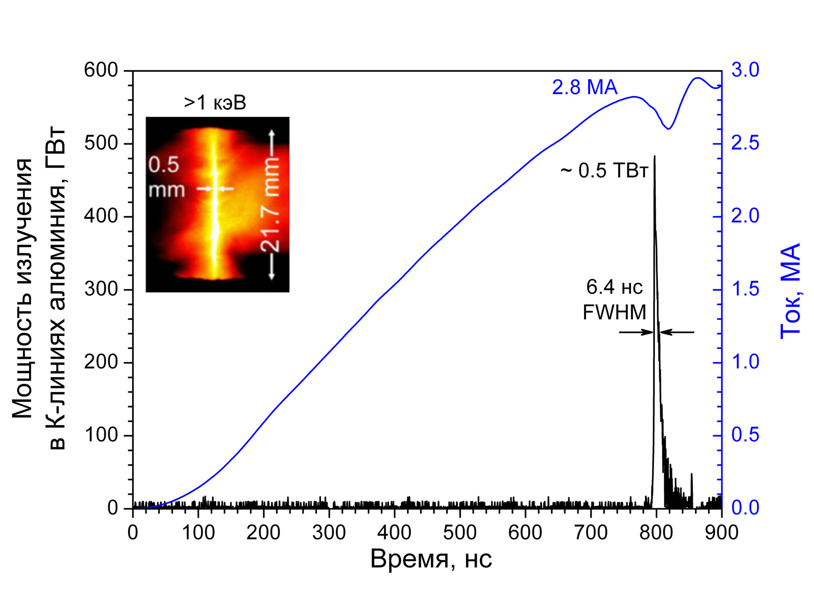 Рис. 1. Временные зависимости тока, мощности излучения в К-линиях алюминия и интегральное изображение пинча в диапазоне энергий квантов свыше 1 кэВ (диаметр алюминиевого проводника 100 мкм).