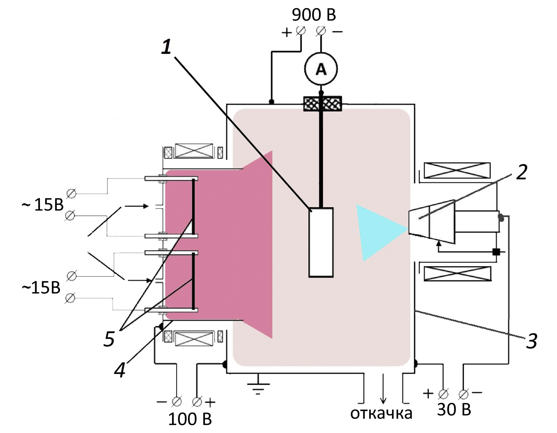 Рис. 1. Схема эксперимента: 1 - подложкодержатель; 2 - дуговой испаритель ДИ80 с ВЭС-катодом; 3 - вакуумная камера; 4 - протяженный генератор газовой плазмы ПИНК-П; 5 - накалённые катоды