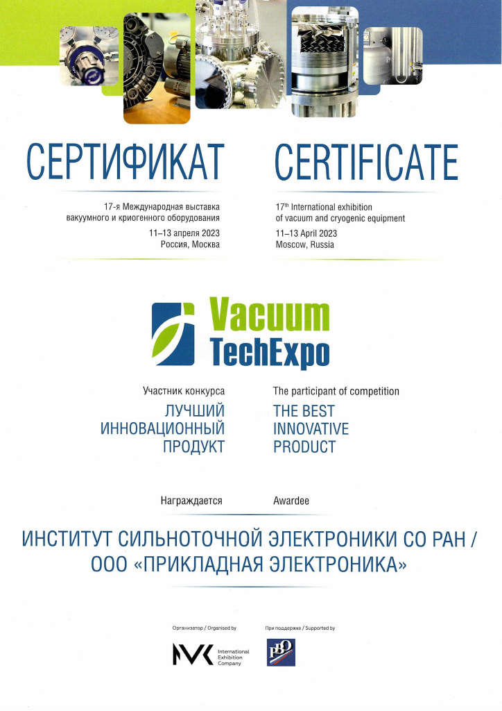 В рамках 17-й Международной специализированной выставки вакуумного и криогенного оборудования VacuumTechExpo (11-13 апреля 2023 г.) Институт сильноточной электроники СО РАН и малое инновационное предприятие ООО «Прикладная электроника» стали победителями в конкурсе "Лучший инновационный продукт в сфере высоких технологий" за совместную разработку «Планарный магнетрон с инжекцией электронов».