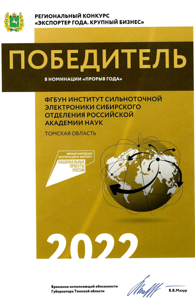 Подведены итоги конкурса «Экспортер года. Крупный бизнес». Институт сильноточной электроники СО РАН стал победителем в региональном конкурсе «Экспортер года. Крупный бизнес» в номинации «Прорыв года».