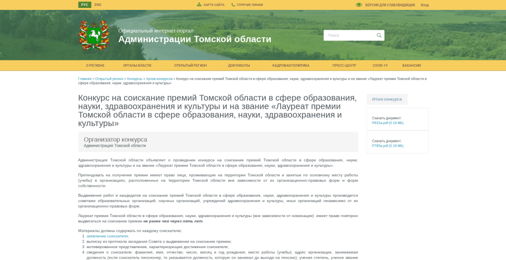 Открыт прием заявок для участия в конкурсе на соискание премий Томской области в сфере образования, науки, здравоохранения и культуры и на звание «Лауреат премии Томской области в сфере образования, науки, здравоохранения и культуры»