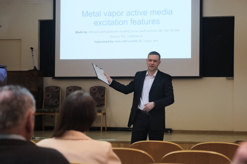 Ведущим секции на русском языке стал младший научный сотрудник ИСЭ СО РАН кандидат технических наук Сергей Дорошкевич. Здесь лучшим было признано сообщение инженера ИМКЭС СО РАН Анастасии Матюхиной «Реконструкция и анализ многолетних температурных рядов на примере Тункинской котловины в 1934-2022 гг.» На втором месте – младший научный сотрудник ИСЭ СО РАН Александр Черкасов с докладом «Сильноточный импульсный магнетронный разряд с внешней инжекцией электронов: особенности, преимущества, перспективы». И на третьем – выступление младшего научного сотрудника ИОА СО РАН Егора Богача «Распознавание орбитального углового момента лазерных пучков».