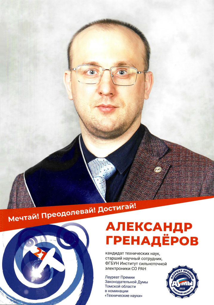 Сердечно поздравляем старшего научного сотрудника лаборатории прикладной электроники, доктора технических наук Гренадёрова Александра с победой в конкурсе на соискание премии Законодательной Думы Томской области для молодых ученых по направлению «Технические науки» в 2023 г.