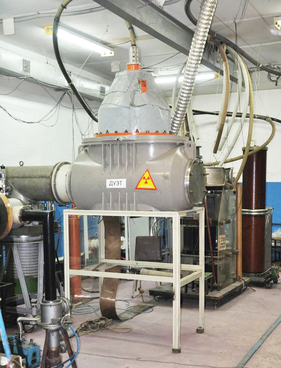 Установка «ДУЭТ» предназначена для генерации широкоаппертурного 15×75 см2 электронного пучка, выведенного через фольговое выпускное окно в атмосферу или газ высокого давления. Использование импульсного дугового разряда в плазменном эмиттере этого источника позволяет реализовать ряд общеизвестных преимуществ, которые недостижимы в других электронных источниках подобного типа. Название «ДУЭТ» связано с тем, что одновременно для генерации эмиссионной плазмы используется два электродуговых плазмогенератора, работающих параллельно, т.е. дуэтом.