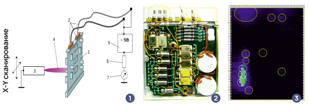 Процесс сканирования электронной платы плазменной струёй (1) Плата экспериментального модуля (2) и результат её сканирования плазменной струёй (3). Дефекты сканирования и их локализация на плате показаны пунктирными окружностями.
