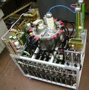 Данный модулятор предназначен для питания СВЧ магнетрона с выходной импульсной мощностью излучения 3 МВт. В модуляторе используются 100 параллельно включенных IGBT транзисторов, коммутирующих свои конденсаторы на первичную обмотку импульсного трансформатора.